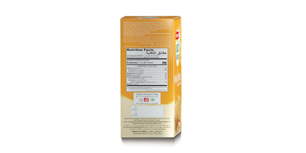 دقيق القمح الكامل، دهن نباتي (نخيل)، زيت النخيل، سكر، بيكربونات الأمونيوم (E503(ii)) وبيكربونات الصوديوم (E500(ii)) (عوامل التخمير)، سكر معكوس، ملح، مسحوق مصل اللبن (من حليب البقر أو الجاموس)، خميرة، نكهة اصطناعية (زبدة)، ليسيثين الصويا (E322)(i) وأحادي وثنائي الجليسريد للأحماض الدهنية (النخيل) (E471) (مستحلبات)، ميتابيسلفيت الصوديوم (E223)، بروتياز البكتيريا (E1101(i)) وألفا أميليز الفطرية (E1100) (عوامل معالجة الدقيق).