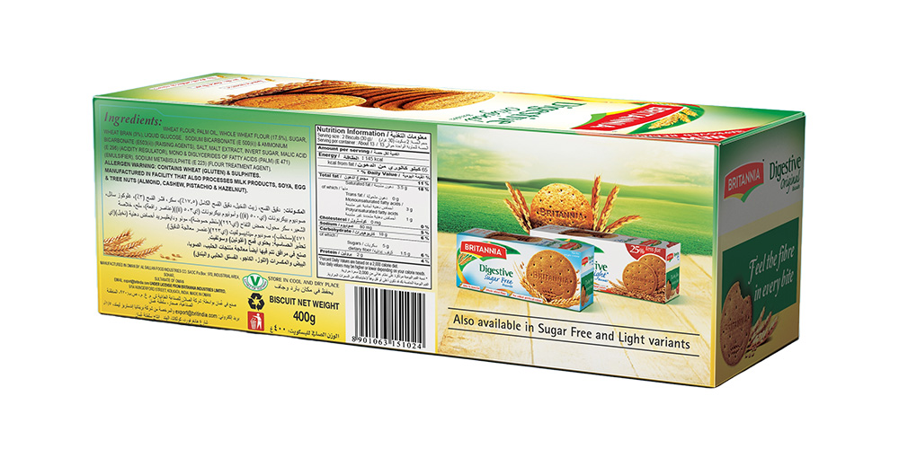 دقيق القمح، دهن نباتي (نخيل)، دقيق قمح كامل، سكر، نخالة قمح، بيكربونات الصوديوم (E500(ii)) وبيكربونات الأمونيوم (E503(ii)) (عوامل التخمير)، جلوكوز سائل، ملح، مستخلص الشعير، سكر معكوس، حمض الماليك (E296) (منظم الحموضة)، أحادي وثنائي الجلسريد للأحماض الدهنية (نخيل) (E471) (مستحلب)، ميتابيسلفيت الصوديوم (E223) (عامل معالجة الدقيق).