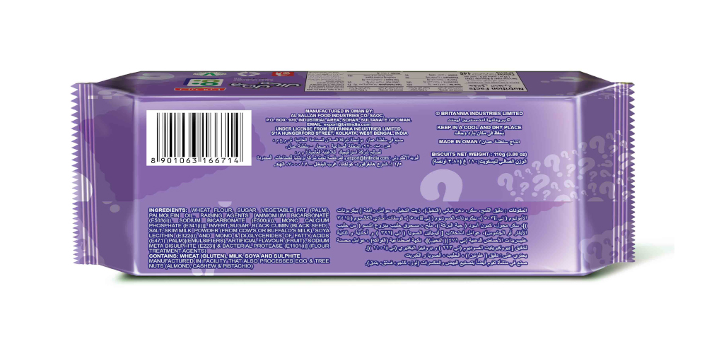 Wheat flour, sugar, vegetable fat (palm), palmolein oil, raising agents [ammonium bicarbonate (E503(II)), sodium bicarbonate (E500(II)), mono calcium phosphate (E341(I))], invert sugar, black cumin (black seed), salt, skim milk powder (from cow’s or buffalo’s milk), soya lecithin (E322(I)) and mono & di-glycerides of fatty acids (E471) (palm) (emulsifiers), artificial flavour (fruit), sodium metabisulphite (E223), and bacterial protease (E1101(I)) (flour treatment agents).