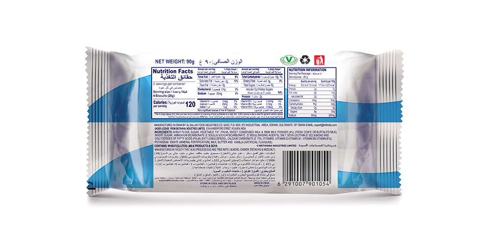 Wheat Flour, Sugar, Vegetable Oil (Palm Oil), Sweet Condensed Milk & Skim Milk Powder (From Cow’s or Buffalo’s Milk), Invert Sugar, Ammonium Bicarbonate (E503(ii)) & Sodium Bicarbonate (E500(ii)) (Raising Agents), Salt, Soya Lecithin (E322) & Mono and Diglycerides of Fatty Acids (Palm) (E471) (Emulsifiers), Calcium Carbonate (E170), Vitamins (Vitamin D, Vitamin B1, Vitamin B6, Vitamin B12), Potassium Iodate (Mineral Fortification), Milk, Butter, and Vanilla (Artificial Flavours).